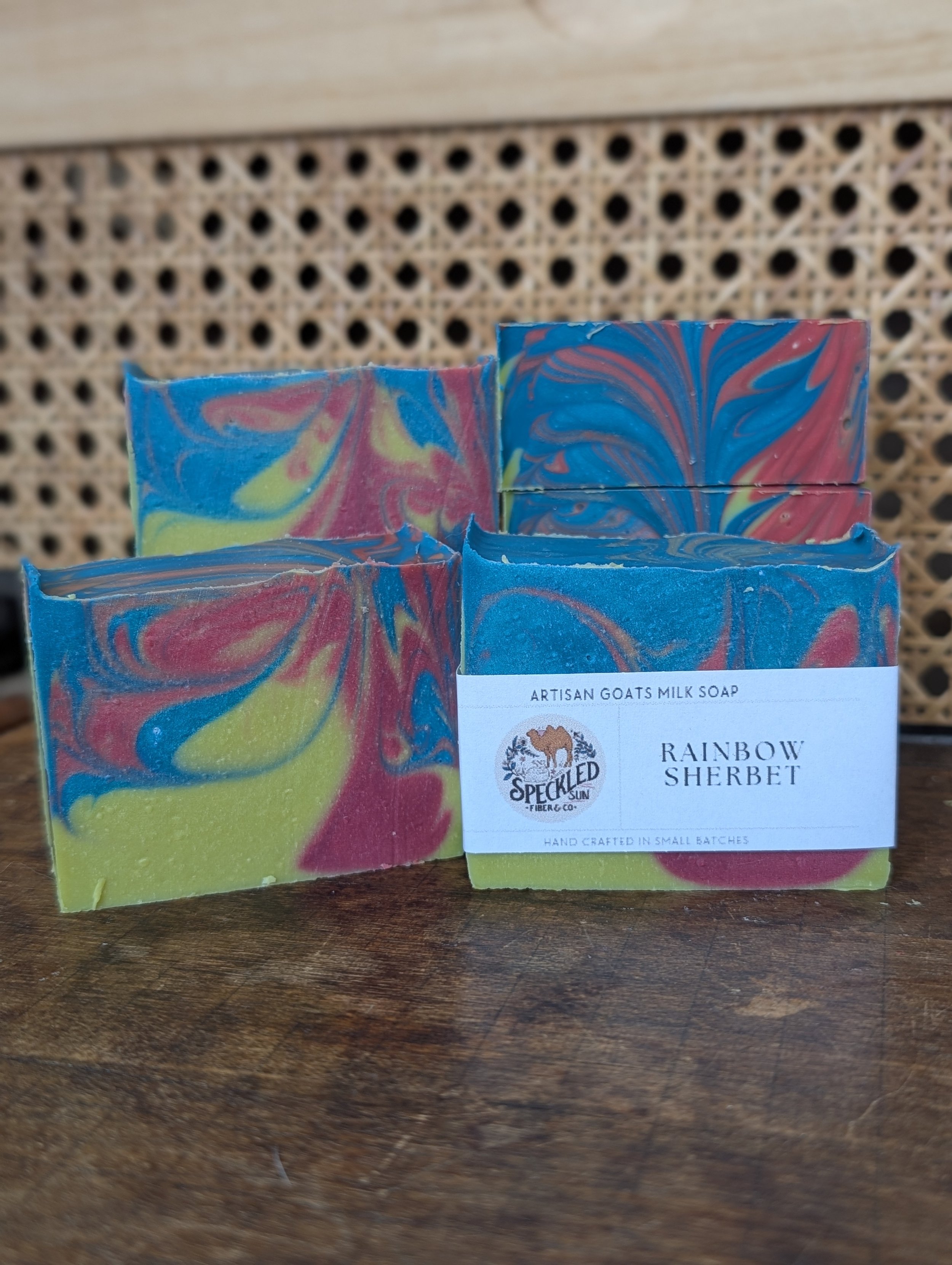 Goat Milk Bar Soap with a sweet and playful scent and bright and fun color designs. Each bar is slightly different from the next in this batch! These cleansing and conditioning bars have a great lather and are long-lasting!